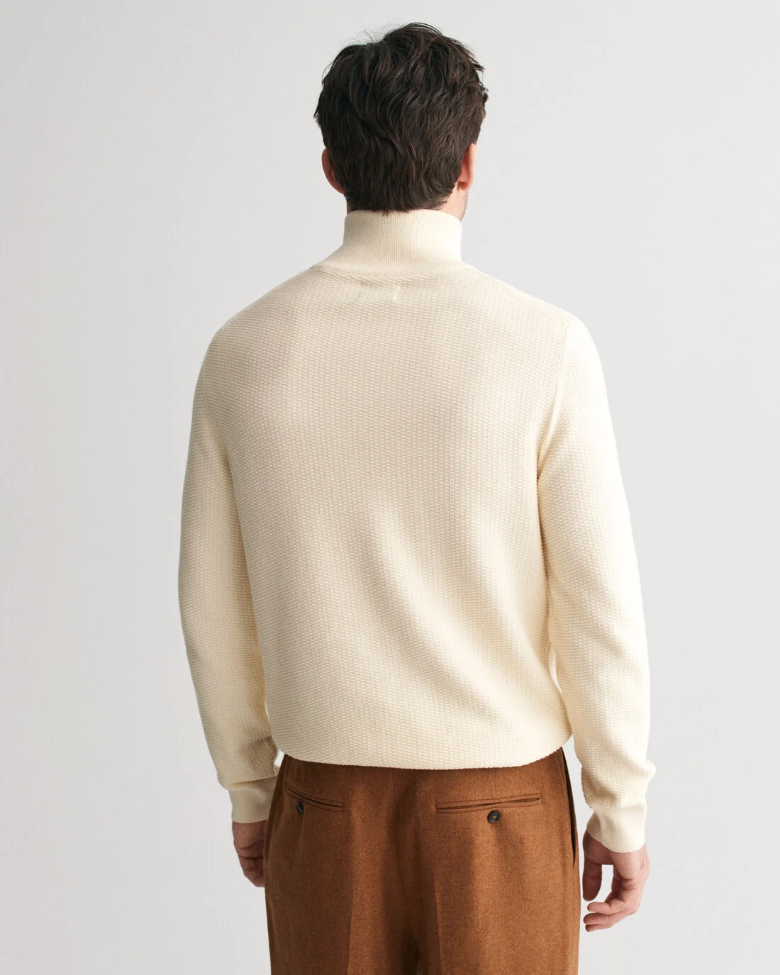 این بافت نیم‌زیپ از برند GANT با طراحی میکرو بافت (Micro Textured) و رنگ کرم، انتخابی عالی برای استایل‌های روزمره و نیمه‌رسمی است. ترکیب بافت ظریف و رنگ ملایم، ظاهری شیک و مدرن به ارمغان می‌آورد.